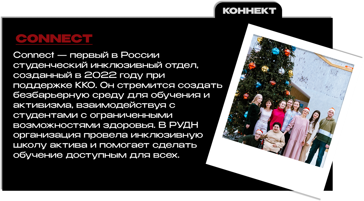Первый в России студенческий инклюзивный отдел, созданный в 2022 году при поддержке ККО. Он стремится создать безбарьерную среду для обучения и активизма, взаимодействую со студентами с ограниченными возможностями здоровья. В РУДН организация провела инклюзивную школу актива и помогает сделать обучение доступным для всех.
